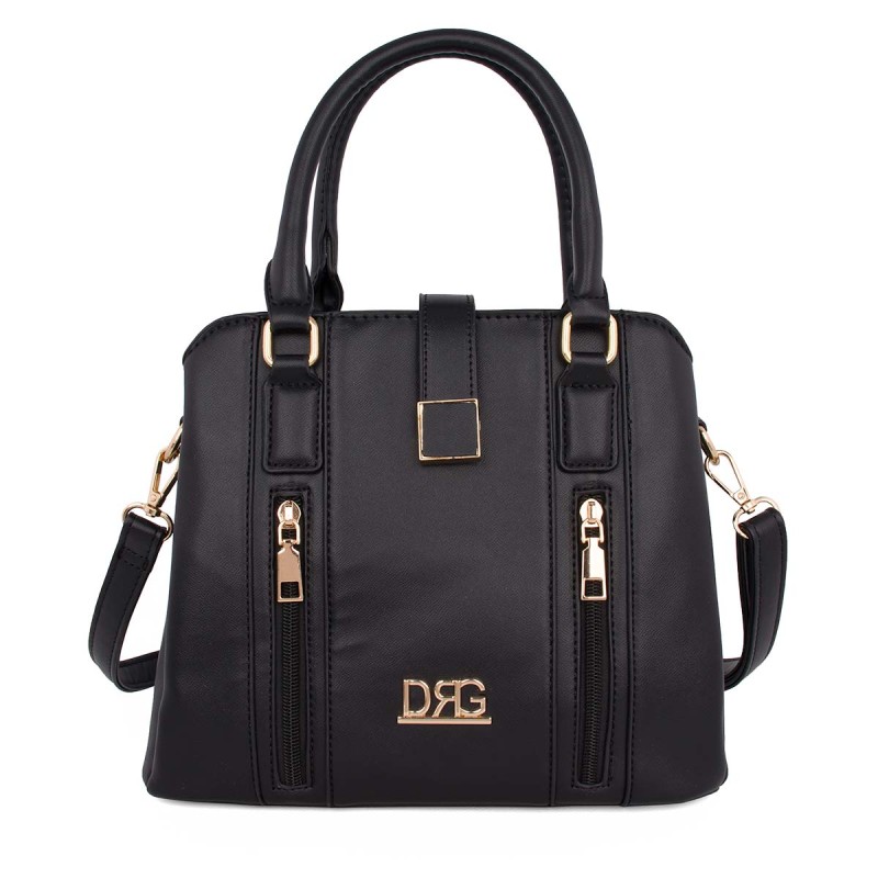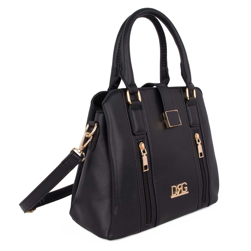 Women's black shoulder bag. Eco-leather. It has 2 internal compartments, one with a zipper, and 3 external zippered pockets on the front and back. It closes with a metallic clasp and zipper. Adjustable, detachable crossbody strap. Dimensions: H 26cm, W 24cm, D 15cm "Designed in Greece exclusively by De Raggi designers".