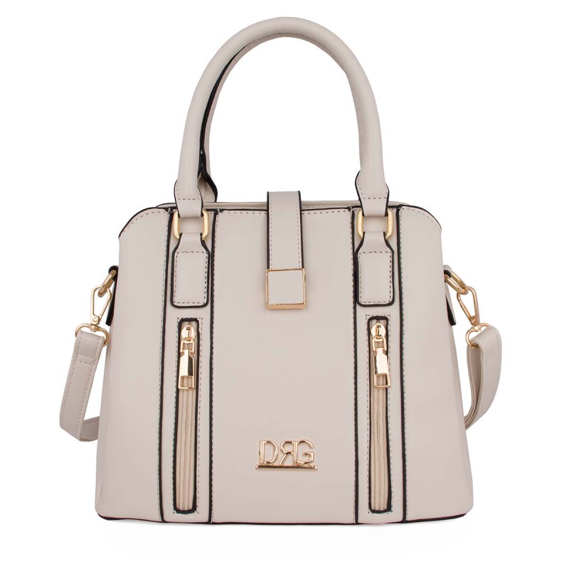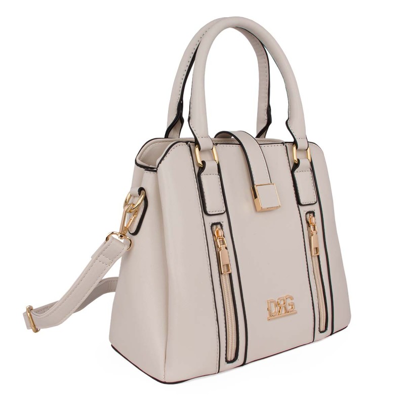 Women's white shoulder bag. Eco-leather. It has 2 internal compartments, one with a zipper, and 3 external zippered pockets on the front and back. It closes with a metallic clasp and zipper. Adjustable, detachable crossbody strap. Dimensions: H 26cm, W 24cm, D 15cm "Designed in Greece exclusively by De Raggi designers".