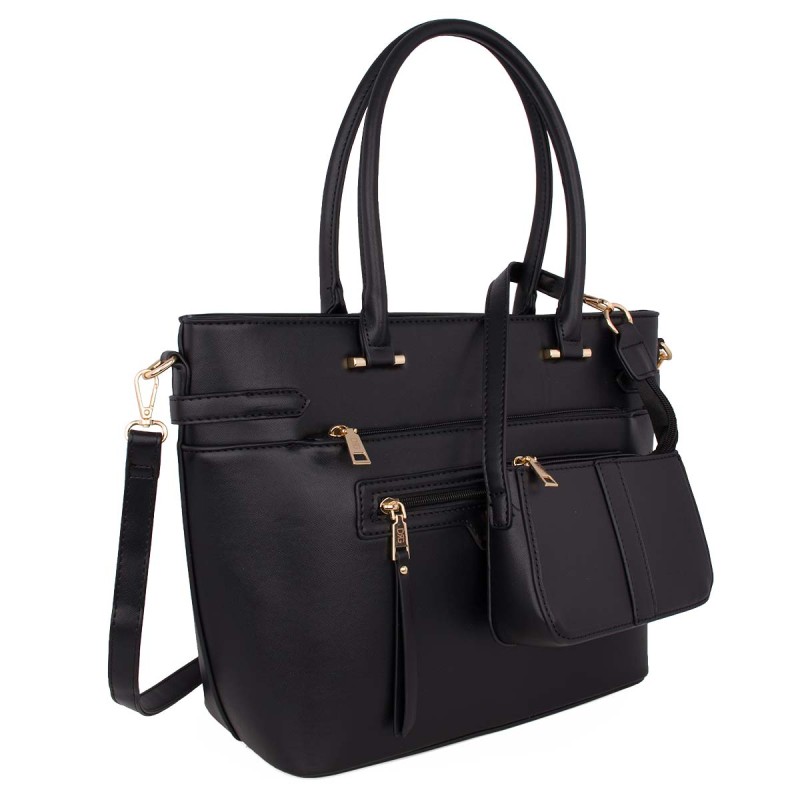 Women's shoulder bag black. Eco-leather. It features 2 internal compartments, one with a zipper, and 2 external zippered pockets on the front. Adjustable, detachable crossbody strap. Extra detachable pouch with zipper. Dimensions: H 28cm, W 34cm, D 12cm. "Designed in Greece exclusively by De Raggi designers".
