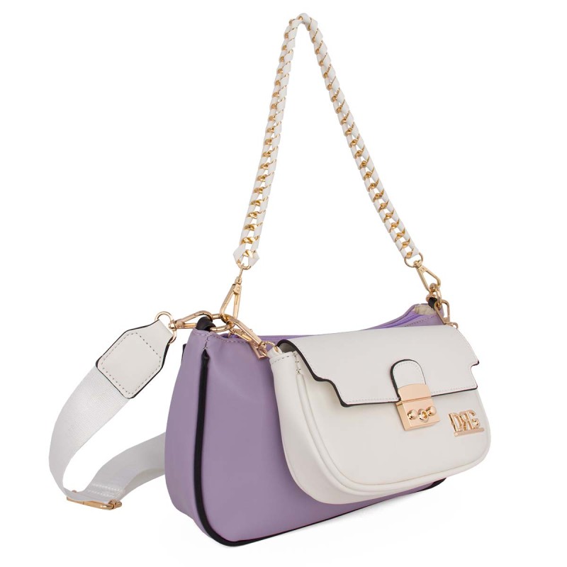 Women's crossbody bag double purple. Eco leather. It features 2 internal compartments, one with a zipper. Chain with braiding. Adjustable, detachable crossbody strap. The bag and chain are detachable. Dimensions: H 18cm, W 28cm, D 9cm. "Designed in Greece exclusively by De Raggi designers".
